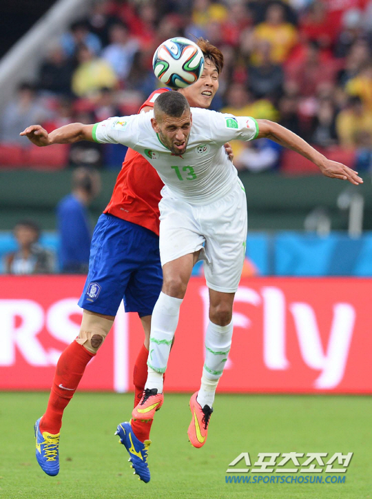 2014브라질월드컵 조별예선 대한민국과 알제리의 경기가 23일 (한국시간) 포르투 알레그레의 에스타디오 베이라리오 경기장에서 열렸다. 한국의 김영권이 알제리 타이더와 치열한 볼경합을 벌이고 있다.