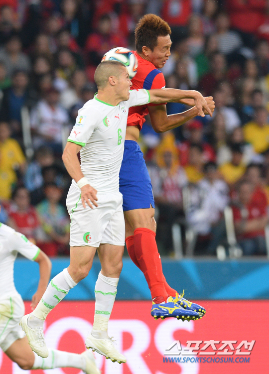 2014브라질월드컵 조별예선 대한민국과 알제리의 경기가 23일 (한국시간) 포르투 알레그레의 에스타디오 베이라리오 경기장에서 열렸다. 한국의 김신욱이 알제리 메스바와 치열한 볼경합을 벌이고 있다. 포르투 알레그레(브라질)=최문영 기자 deer@sportschosun.com