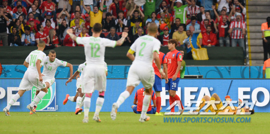 2014브라질월드컵 조별예선 대한민국과 알제리의 경기가 23일 (한국시간) 포르투 알레그레의 에스타디오 베이라리오 경기장에서 열렸다. 한국의 정성룡이 알제리에게 두번째골을 허용하고 있다.