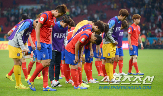 2014브라질월드컵 조별예선 대한민국과 알제리의 경기가 23일 (한국시간) 포르투 알레그레의 에스타디오 베이라리오 경기장에서 열렸다. 태극전사들이 알제리를 상대로 2대4로 대패한후 고개숙여 관중들에게 답례하고 있다.