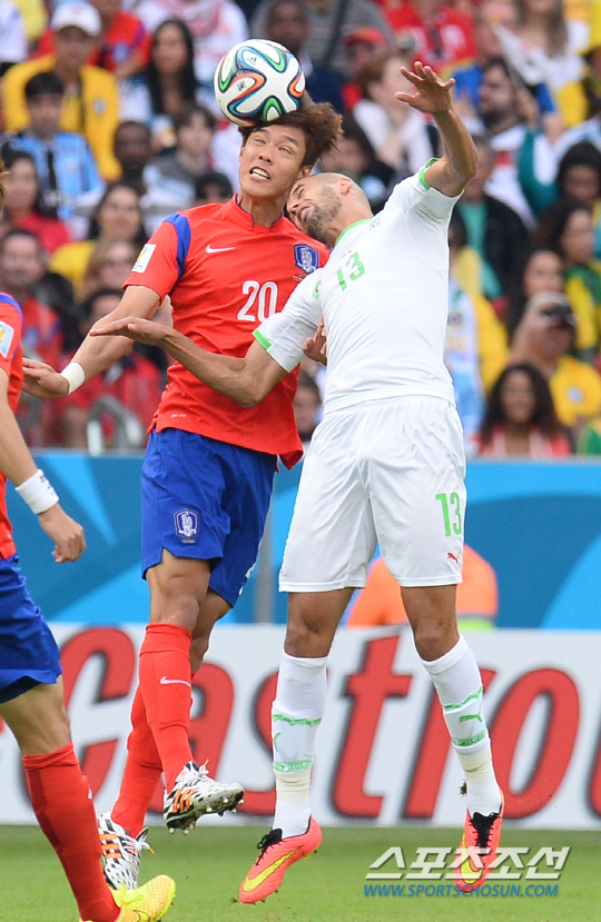 2014브라질월드컵 조별예선 대한민국과 알제리의 경기가 23일 (한국시간) 포르투 알레그레의 에스타디오 베이라리오 경기장에서 열렸다. 한국의 홍정호가 알제리 슬리마니와 치열한 볼경합을 벌이고 있다. 포르투 알레그레(브라질)=최문영 기자 deer@sportschosun.com