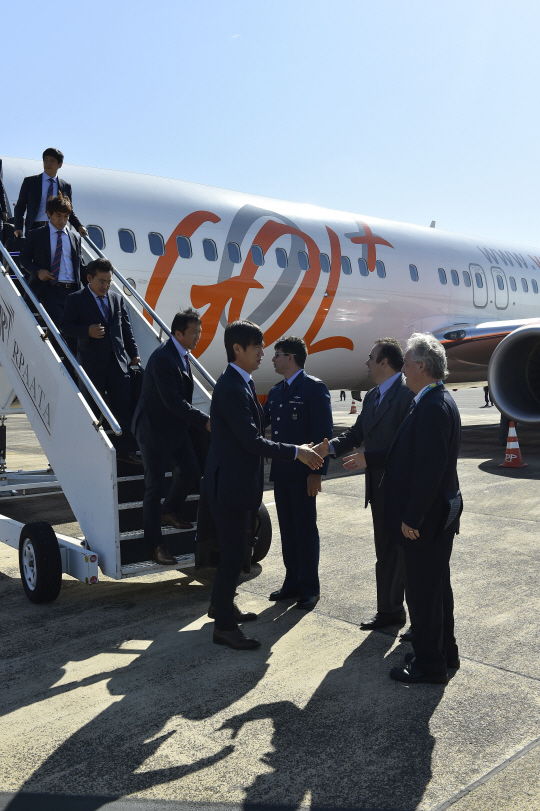 | ◇지난 12일(한국시각) 브라질 이구아수공항에 전세기편으로 도착한 월드컵대표팀이 현지 관계자들의 환영을 받고 있다. 사진제공=대한축구협회 |
