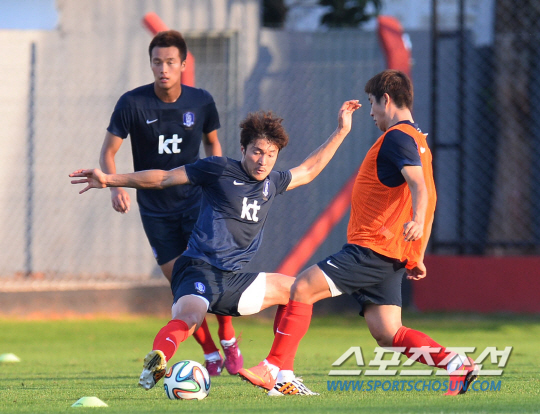 2014브라질월드컵에서 알제리와 조별예선 2차전을 마친 홍명보호가 24일오전(한국시간) 베이스캠프가 있는 이구아수의 플라멩고 경기장에서 회복훈련을 실시했다. 박종우와 박주호가 미니게임 중 볼경합을 벌이고 있다.