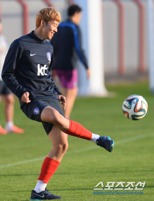 2014브라질월드컵에서 알제리와 조별예선 2차전을 마친 홍명보호가 24일오전(한국시간) 베이스캠프가 있는 이구아수의 플라멩고 경기장에서 회복훈련을 실시했다. 패스게임을 하던 손흥민이 환하게 웃고 있다.