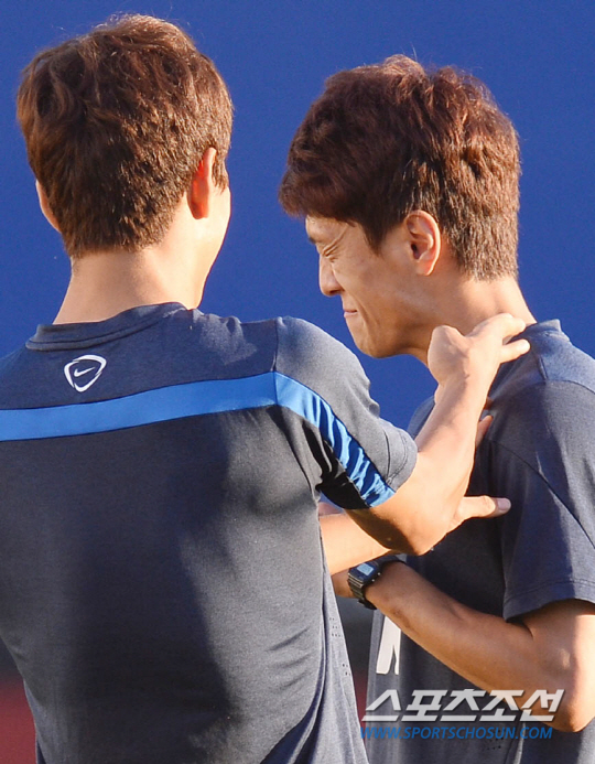 2014브라질월드컵에서 알제리와 조별예선 2차전을 마친 홍명보호가 24일오전(한국시간) 베이스캠프가 있는 이구아수의 플라멩고 경기장에서 회복훈련을 실시했다. 패스게임을 하던 박주영이 공을 놓친 이청용에게 딱밤을 때고 있다.