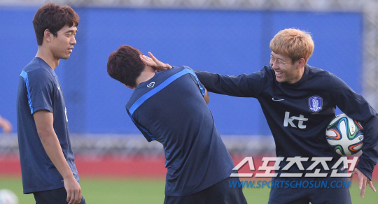 2014브라질월드컵에서 알제리와 조별예선 2차전을 마친 홍명보호가 24일오전(한국시간) 베이스캠프가 있는 이구아수의 플라멩고 경기장에서 회복훈련을 실시했다. 패스게임을 하던 손흥민이 이청용에게 딱밤을 때리고 있다.