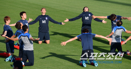 2014브라질월드컵에서 알제리와 조별예선 2차전을 마친 홍명보호가 24일오전(한국시간) 베이스캠프가 있는 이구아수의 플라멩고 경기장에서 회복훈련을 실시했다. 태극전사들이 스트레칭을 하며 컨디션 조절에 집중하고 있다.