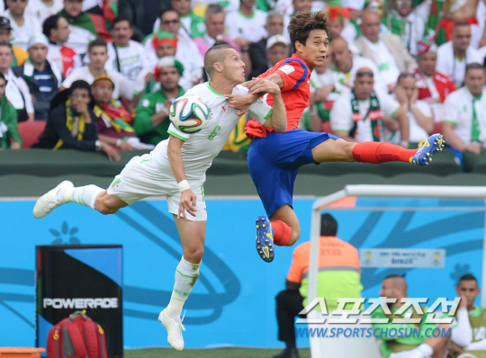 2014브라질월드컵 조별예선 대한민국과 알제리의 경기가 23일 (한국시간) 포르투 알레그레의 에스타디오 베이라리오 경기장에서 열렸다. 한국의 박주영이 알제리 메스바와 공중볼을 다투고 있다. 포르투 알레그레(브라질)=최문영 기자 deer@sportschosun.com /2014.06.23/ |