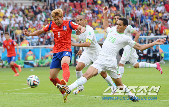 2014브라질월드컵 조별예선 대한민국과 알제리의 경기가 23일 (한국시간) 포르투 알레그레의 에스타디오 베이라리오 경기장에서 열렸다. 한국의 손흥민이 알제리 만디와 치열한 볼경합을 벌이고 있다. 포르투 알레그레(브라질)=최문영 기자 deer@sportschosun.com /2014.06.23/