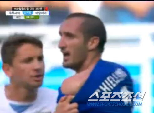 0-0으로 맞서던 후반 34분 사건이 터졌다. 이탈리아의 골문 앞에서 수아레스는 조르지오 키엘리니(이탈리아)와 치열한 몸싸움을 펼쳤다. 수아레스가 키엘리니의 왼쪽 어깨를 물었다. 키엘리니도 쓰러졌고 수아레스 역시 입을 감싸며 쓰러졌다. 마치 실수로 이를 부딪친 것처럼 행동했다. 느린 화면에는 수아레스가 어깨를 무는 장면이 포착됐다. 그러나 주심은 물론 부심도 이 장면을 제대로 보지 못했다. 카드가 나오지 않았다. 키엘리니가 자신의 어깨에 물린 자국을 보여주며 반칙을 주장했지만, 받아들여지지 않았다.