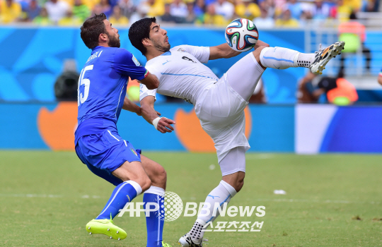 25일 벌어진 브라질 월드컵 D조 예선경기에서 우르과이 골잡이 수아레스가 이탈리아 수비수 바잘리를 등지고 볼을 다루고 있다.