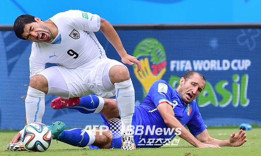 25일 벌어진 브라질 월드컵 D조 예선경기에서 이탈리아 수비수 키엘리니가 우르과이 수아레스에게 태클을 가하고 있다. 수아레스는 경기중 키엘리니의 어깨를 물어 뜯었다.
