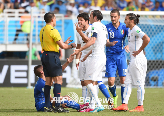 25일 벌어진 브라질 월드컵 D조 예선경기에서 우르과이 골잡이 수아레스가 멕시코인 주심 마르코 안토니오 로드리게스 모레노 주심에게 불평을 하고 있다.