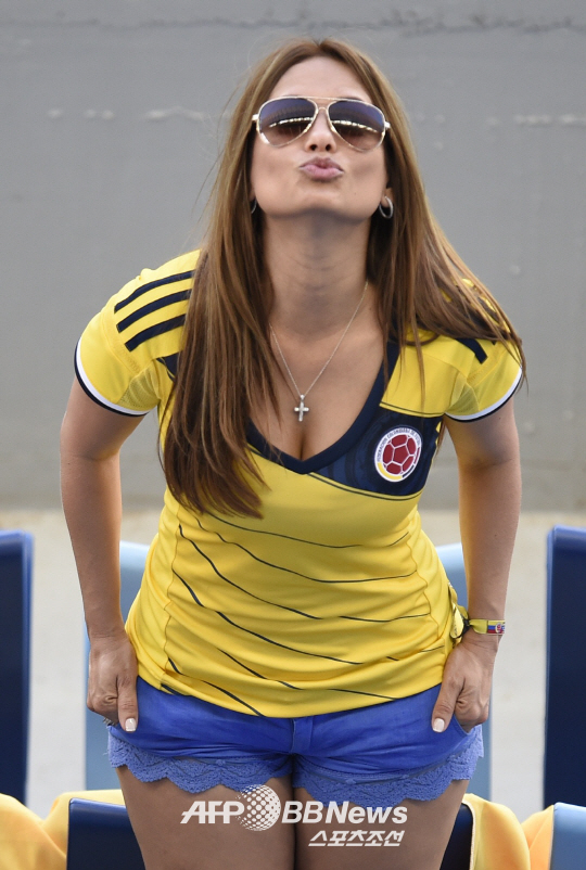25일 벌어진 브라질 월드컵 C조 예선 일본과 콜롬비아의 경기에 앞서 한 콜롬비아 여성팬이 사진기자를 보며 키스를 날리고 있다.