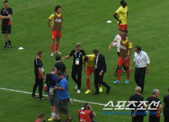 러시아와의 2차전을 앞두고 몸을 풀던 중 뱅상 콩파니와 부딪혀 부상을 한 베르마엘렌이 의료진의 부축을 받고 경기장을 빠져나가고 있다. 리우데자네이루(브라질)=하성룡 기자