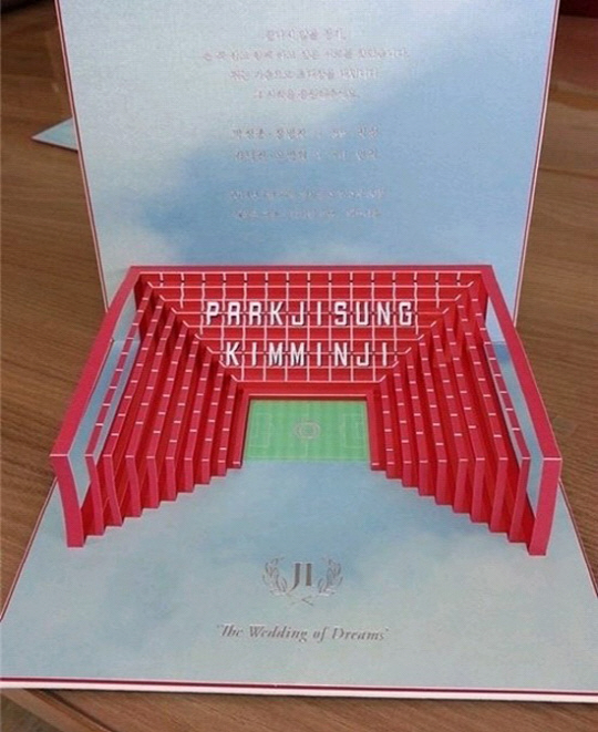 팝업 형식의 청첩장을 열면 붉은색 축구 경기장 모형이 나타난다. 또 청첩장 가운데는 박지성-김민지의 영어 이름이 적혀있다.