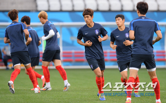2014브라질월드컵에서 벨기에와 조별예선 3차전을 앞둔 홍명보호가 26일(한국시간)상파울루의 아레나 코린치안스에 도착해 적응훈련을 실시했다. 박주영과 태극전사들이 가벼운 러닝으로 경기장 환경에 적응하고 있다. H조에서 1무1패로 최하위를 기록중인 한국은 27일(한국시간) 벨기에와 조별예선 마지막 경기를 앞두고 있다. 상파울루(브라질)=최문영 기자 deer@sportschosun.com