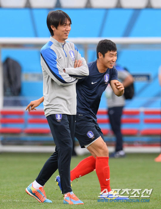 2014브라질월드컵에서 벨기에와 조별예선 3차전을 앞둔 홍명보호가 26일(한국시간)상파울루의 아레나 데 상파울루 경기장에 도착해 적응훈련을 실시했다. 홍명보감독이 스트레칭을 하는 이근호에게 이야기를 건네고 있다.
