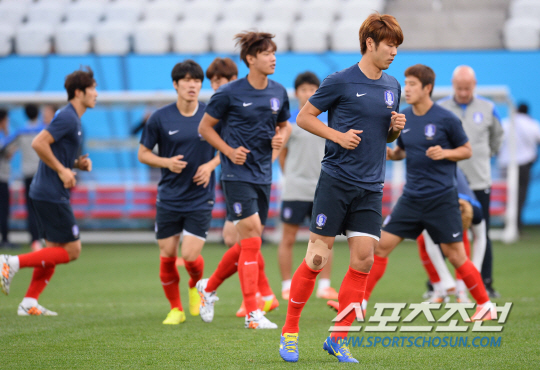 2014브라질월드컵에서 벨기에와 조별예선 3차전을 앞둔 홍명보호가 26일(한국시간)상파울루의 아레나 데 상파울루 경기장에 도착해 적응훈련을 실시했다. 태극전사들이 가벼운 러닝으로 경기장 환경에 적응하고 있다.