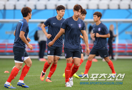 2014브라질월드컵에서 벨기에와 조별예선 3차전을 앞둔 홍명보호가 26일(한국시간)상파울루의 아레나 데 상파울루 경기장에 도착해 적응훈련을 실시했다. 태극전사들이 가벼운 러닝으로 경기장 환경에 적응하고 있다.
