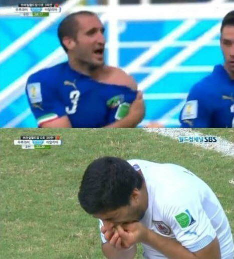 수아레스는 25일(한국시간) 우루과이와 이탈리아의 브라질월드컵 조별리그 D조 3경기에서 후반 34분 상대 수비수 조르죠 키엘리니의 왼쪽 어깨를 깨물었다.