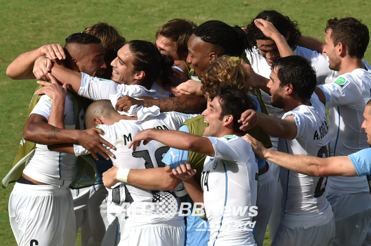 우루과이 선수들이 이탈리아를 누르고 16강행을 확정하자 기뻐하고 있다. ⓒAFPBBNews = News1