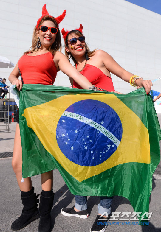 2014브라질월드컵 H조 3차전 한국과 벨기에의 경기가 27일 (한국시간) 상파울루의 아레나 코린치안스경기장에서 열렸다. 각양각색의 복장을 한 축구팬들이 경기장 앞에서 응원전을 펼치고 있다.