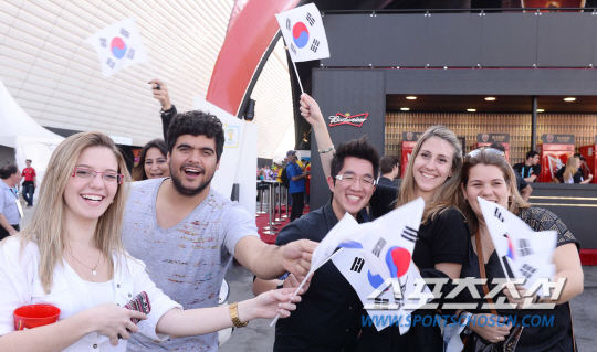 2014브라질월드컵 H조 3차전 한국과 벨기에의 경기가 27일 (한국시간) 상파울루의 아레나 코린치안스경기장에서 열렸다. 각양각색의 복장을 한 축구팬들이 경기장 앞에서 응원전을 펼치고 있다.