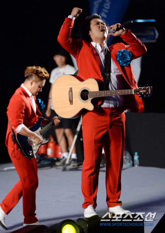 2014 브라질월드컵 조별리그 3차전 벨기에와의 경기를 앞둔 27일 새벽 서울 코엑스 앞 영동대로에서 길거리 응원전이 펼쳐졌다. 장미여관이 멋진 무대를 펼치고 있다.