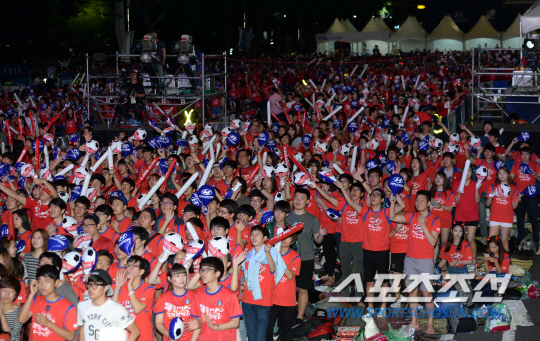 2014 브라질월드컵 조별리그 3차전 벨기에와의 경기를 앞둔 27일 새벽 서울 코엑스 앞 영동대로에서 길거리 응원전이 펼쳐졌다. 영동대로에 모인 시민들이 열띤 응원전을 펼치고 있다.