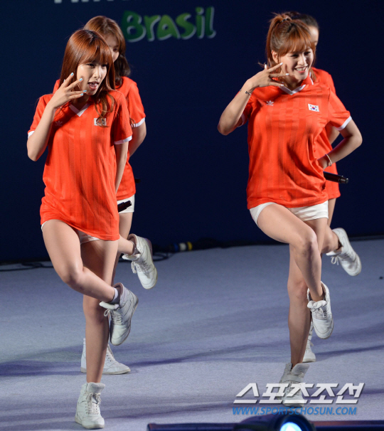 2014 브라질월드컵 조별리그 3차전 벨기에와의 경기를 앞둔 27일 새벽 서울 코엑스 앞 영동대로에서 길거리 응원전이 펼쳐졌다. 레인보우가 멋진 무대를 펼치고 있다.
