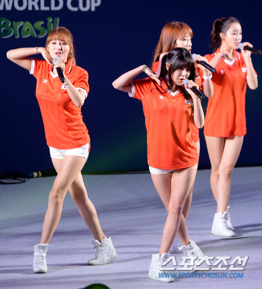 2014 브라질월드컵 조별리그 3차전 벨기에와의 경기를 앞둔 27일 새벽 서울 코엑스 앞 영동대로에서 길거리 응원전이 펼쳐졌다. 레인보우가 멋진 무대를 펼치고 있다.