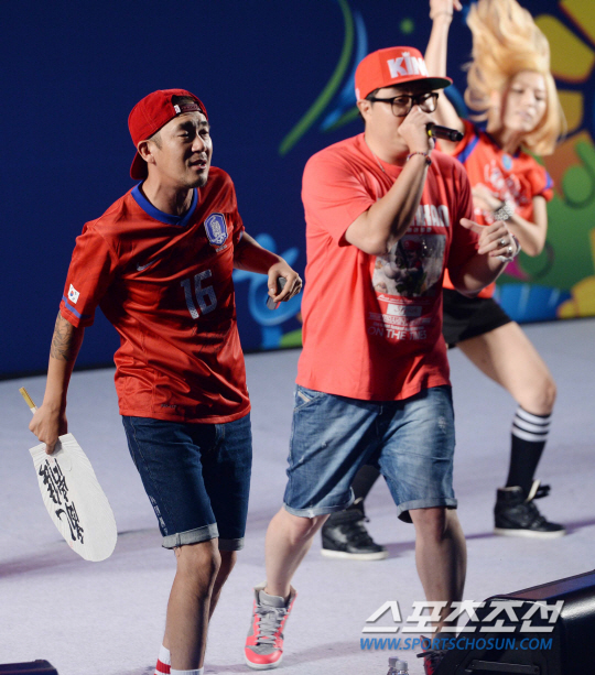 2014 브라질월드컵 조별리그 3차전 벨기에와의 경기를 앞둔 27일 새벽 서울 코엑스 앞 영동대로에서 길거리 응원전이 펼쳐졌다. DJ.DOC가 멋진 무대를 펼치고 있다.