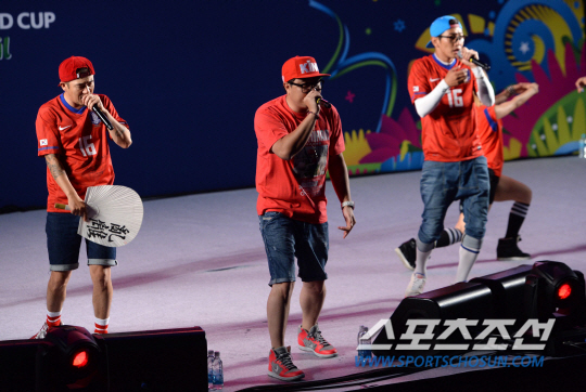 2014 브라질월드컵 조별리그 3차전 벨기에와의 경기를 앞둔 27일 새벽 서울 코엑스 앞 영동대로에서 길거리 응원전이 펼쳐졌다. DJ.DOC가 멋진 무대를 펼치고 있다.