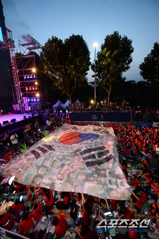 2014 브라질월드컵 조별리그 3차전 벨기에와의 경기를 앞둔 27일 새벽 서울 코엑스 앞 영동대로에서 길거리 응원전이 펼쳐졌다. 대형 태극기가 펼쳐지고 있다.