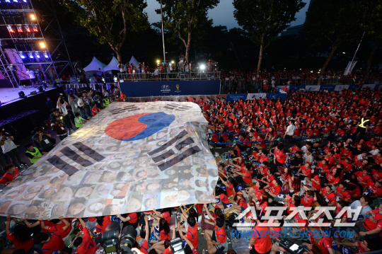 2014 브라질월드컵 조별리그 3차전 벨기에와의 경기를 앞둔 27일 새벽 서울 코엑스 앞 영동대로에서 길거리 응원전이 펼쳐졌다. 대형 태극기가 펼쳐지고 있다.