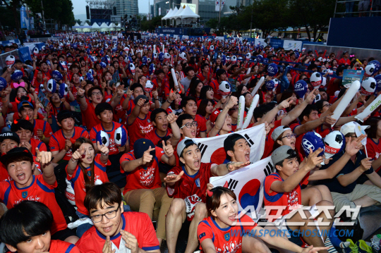 2014 브라질월드컵 조별리그 3차전 벨기에와의 경기를 앞둔 27일 새벽 서울 코엑스 앞 영동대로에서 길거리 응원전이 펼쳐졌다. 시민들이 경기를 지켜보며 응원을 펼치고 있다.