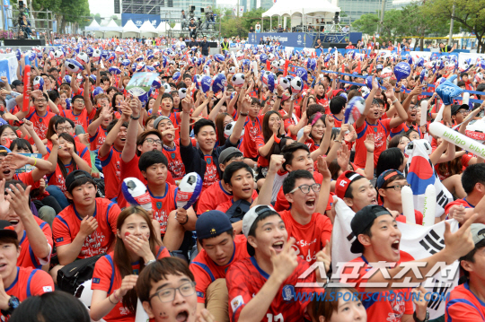 2014 브라질월드컵 조별리그 3차전 벨기에와의 경기를 앞둔 27일 새벽 서울 코엑스 앞 영동대로에서 길거리 응원전이 펼쳐졌다. 시민들이 경기를 지켜보며 응원을 펼치고 있다.