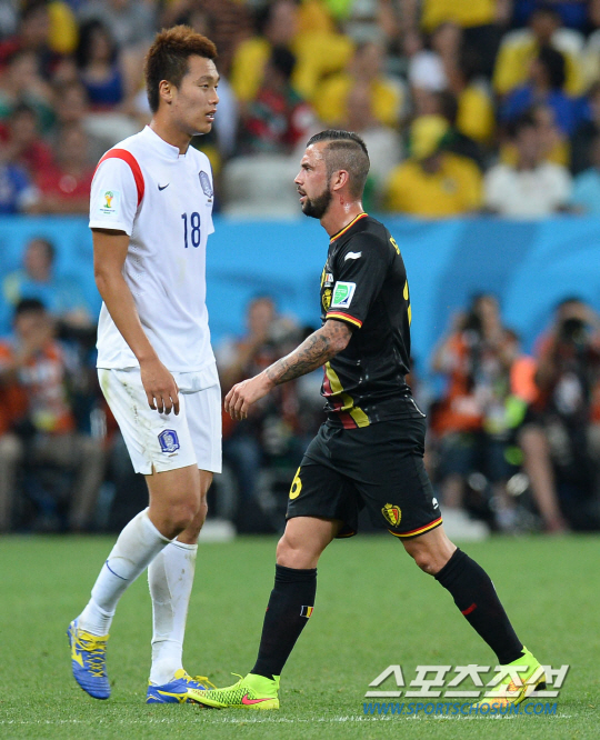 2014브라질월드컵 H조 3차전 한국과 벨기에의 경기가 27일 (한국시간) 상파울루의 아레나 코린치안스경기장에서 열렸다. 한국의 김신욱이 벨기에의 드프루에게 태클을 당했다. 이것으로 드프루는 퇴장을 레드카드를 받고 퇴장당하고 있다.