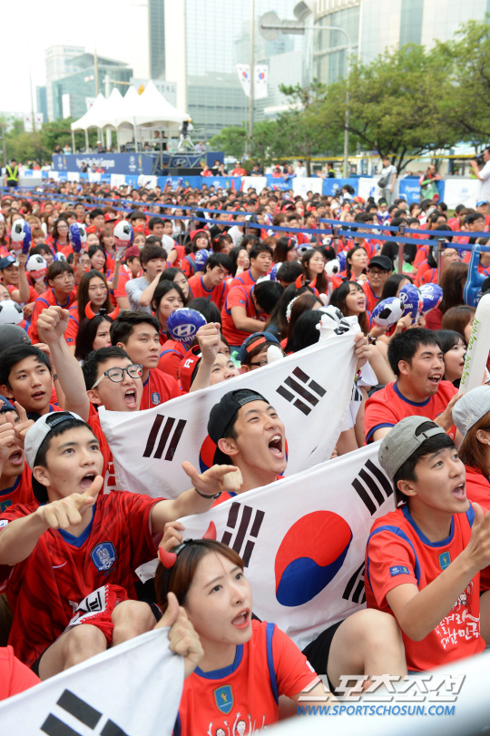 2014 브라질월드컵 조별리그 3차전 벨기에와의 경기를 앞둔 27일 새벽 서울 코엑스 앞 영동대로에서 길거리 응원전이 펼쳐졌다. 시민들이 경기를 지켜보며 응원을 펼치고 있다.