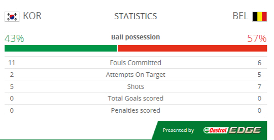 전반 한국은 5개의 슈팅을 쏘아올렸고 이중 2개가 유효슈팅이었다. 벨기에는 7개의 슈팅중 5개가 유효슈팅이었다. 김승규의 선방이 빛났다. 스포츠2팀