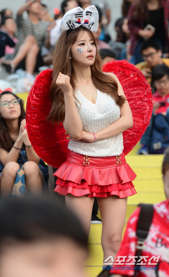 2014 브라질월드컵 조별리그 3차전 벨기에와의 경기를 앞둔 27일 새벽 서울 세종로 광화문광장에서 길거리 응원이 펼쳐졌다. 한 미녀팬이 가슴을 졸이며 경기를 지켜보고 있다.