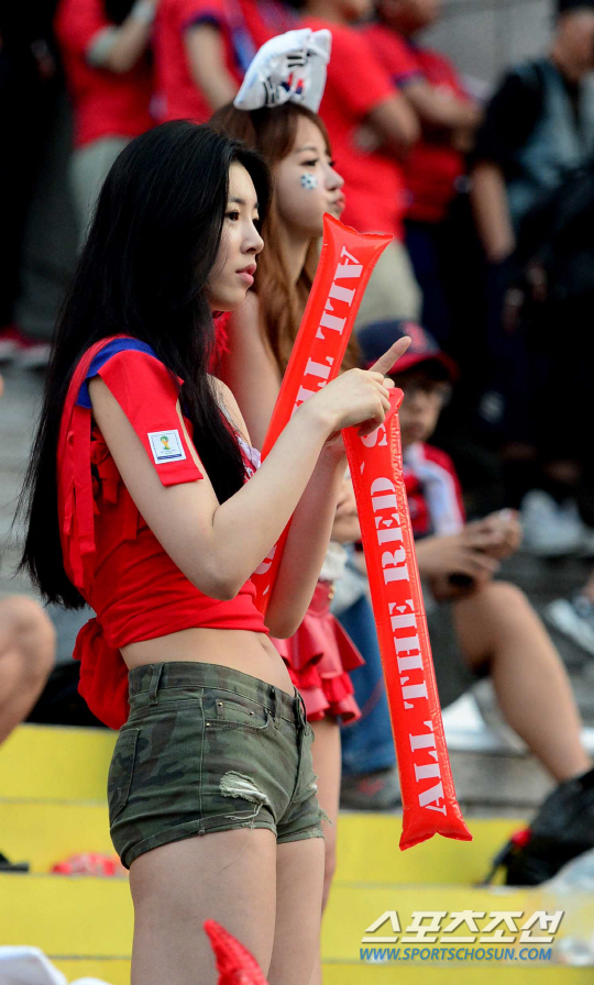 2014 브라질월드컵 조별리그 3차전 벨기에와의 경기를 앞둔 27일 새벽 서울 세종로 광화문광장에서 길거리 응원이 펼쳐졌다. 여성팬들이 가슴을 졸이며 경기를 지켜보고 있다.