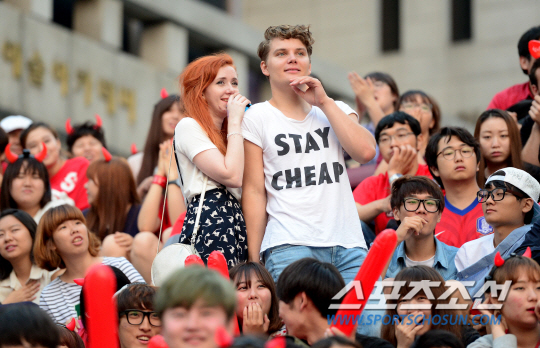 2014 브라질월드컵 조별리그 3차전 벨기에와의 경기를 앞둔 27일 새벽 서울 세종로 광화문광장에서 길거리 응원이 펼쳐졌다. 외국인 커플이 시민들과 함께 경기를 지켜보고 있다.
