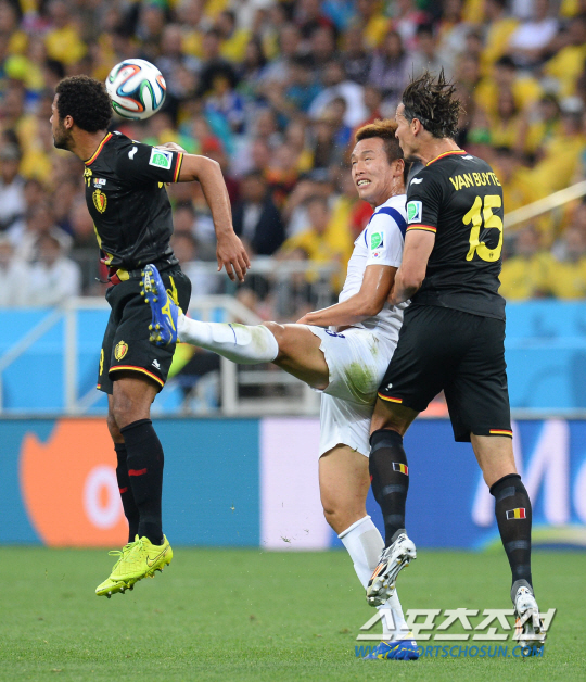 2014브라질월드컵 H조 3차전 한국과 벨기에의 경기가 27일 (한국시간) 상파울루의 아레나 코린치안스경기장에서 열렸다. 한국의 김신욱이 벨기에의 반 바이텐과 치열한 볼경합을 벌이고 있다.