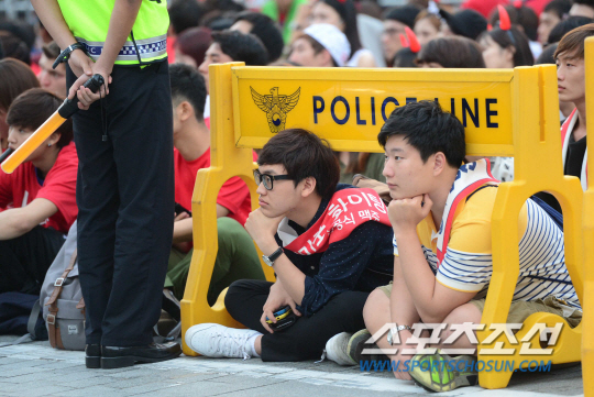 2014 브라질월드컵 조별리그 3차전 벨기에와의 경기를 앞둔 27일 새벽 서울 세종로 광화문광장에서 길거리 응원이 펼쳐졌다. 남성 축구팬들이 가슴을 졸이며 경기를 지켜보고 있다.