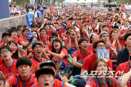 2014 브라질월드컵 조별리그 3차전 벨기에와의 경기를 앞둔 27일 새벽 서울 코엑스 앞 영동대로에서 길거리 응원전이 펼쳐졌다. 벨기에의 선제골이 터지자 이를 지켜보던 시민들이 아쉬워하고 있다.