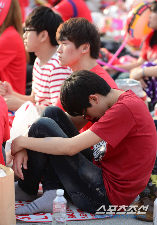 2014 브라질월드컵 조별리그 3차전 벨기에와의 경기를 앞둔 27일 새벽 서울 세종로 광화문광장에서 길거리 응원이 펼쳐졌다. 한국팀이 0대1로 패하며 1무2패, 조 최하위로 16강 진출이 좌절됐다. 실망감을 감추지 못하고 있는 시민들의 모습.