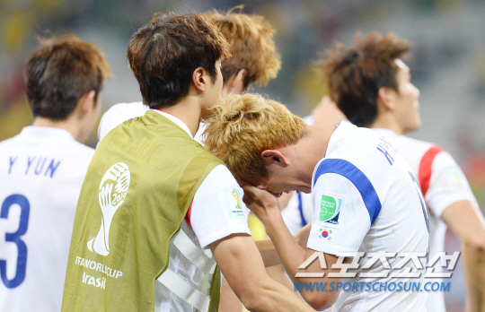 2014브라질월드컵 H조 3차전 한국과 벨기에의 경기가 27일 (한국시간) 상파울루의 아레나 코린치안스경기장에서 열렸다. 손흥민과 태극전사들이 벨기에에 0대1로 패한후 경기장을 걸어나오고 있다.