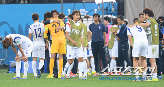 2014브라질월드컵 H조 3차전 한국과 벨기에의 경기가 27일 (한국시간) 상파울루의 아레나 코린치안스경기장에서 열렸다. 태극전사들이 벨기에에 0대1로 패한후 팬들에게 답례하며 퇴장하고 있다.